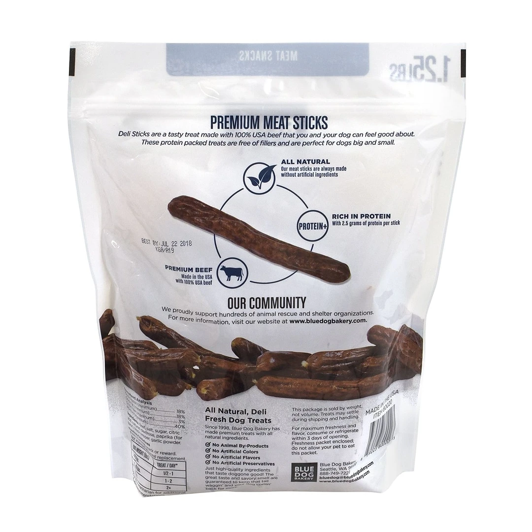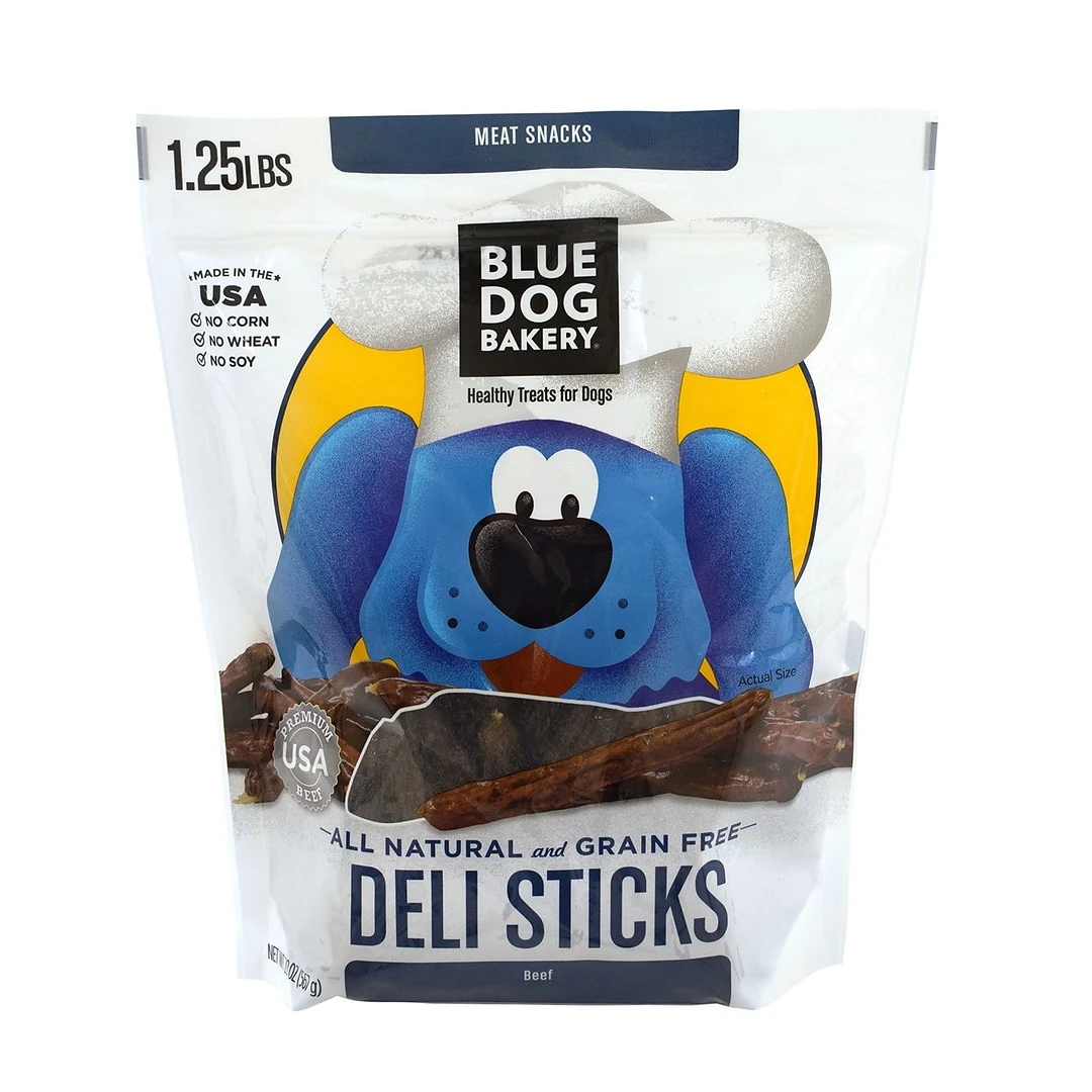 Reward your dog the right way with these great-tasting Blue Dog Bakery Deli Sticks dog treats. Made with premium USA beef and no corn, wheat, or soy, these healthy dog treats are packed with Beef flavor that you pup will love. Each Beef deli stick has 2.5-grams of protein. Let your dog snack well with these all-natural, healthy dog treats that are made without any artificial ingredients. Blue Dog Bakery dog treats are great for home or for dog-friendly offices!