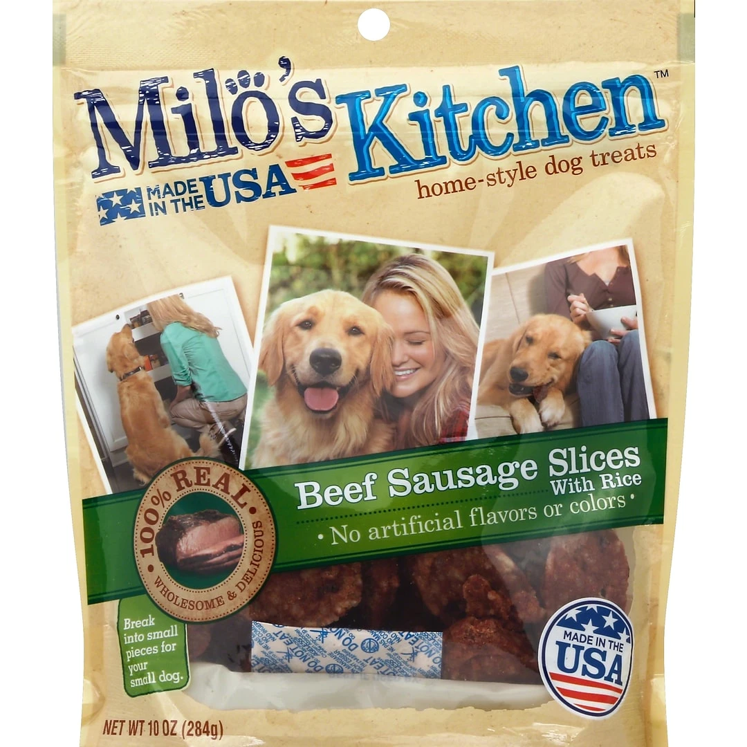 Milo’s Kitchen Sausage Slices With Rice is a meaty, home-style recipe with real beef for big flavor in every bite! Treat your furry family member to a slice of the good life with a mouthwatering sausage snack that’s cooked to perfection for an authentic beef taste – made right here in the USA.