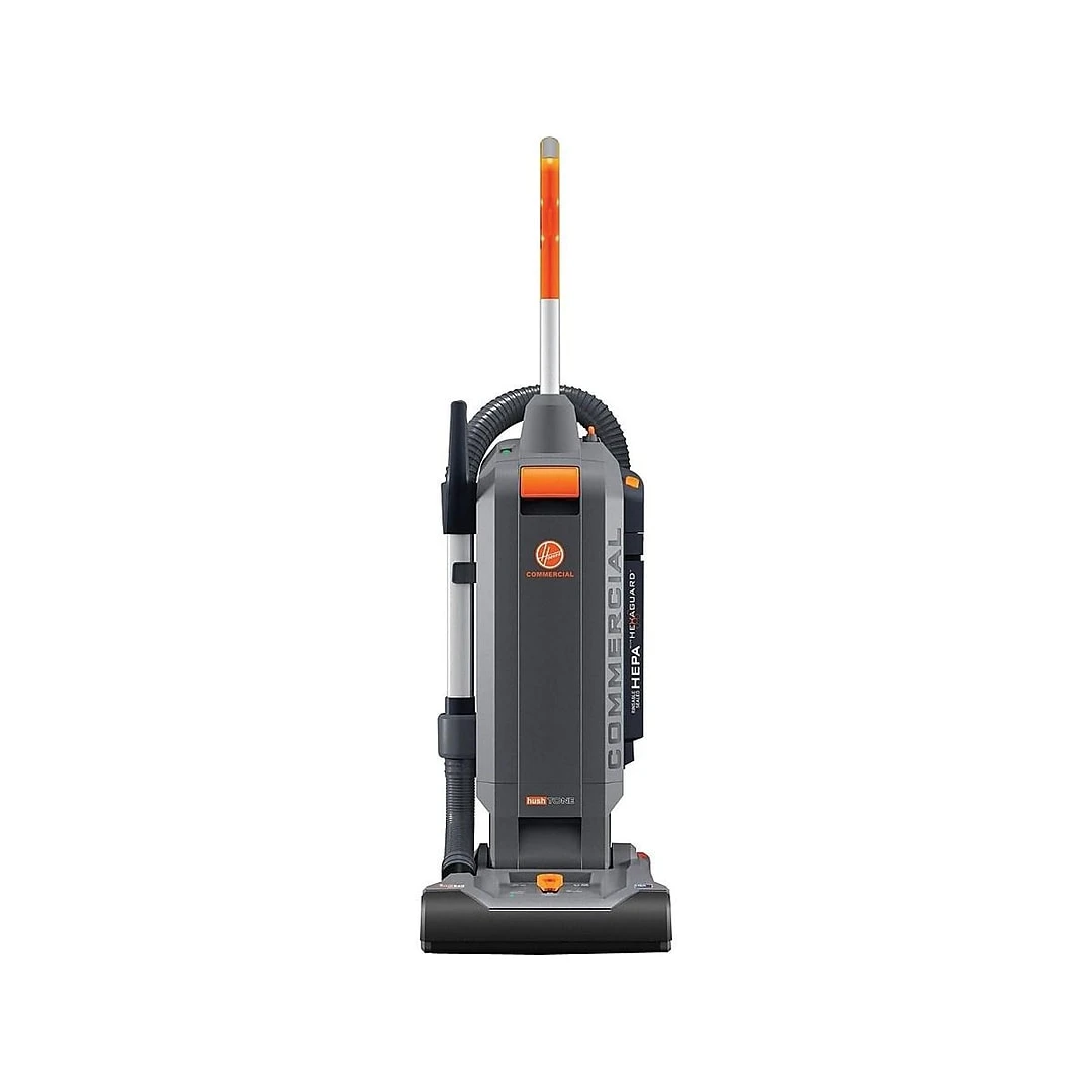 Keep the carpets in your building looking fresh and clean with this upright vacuum. The two-speed motor provides quiet operation, so you can vacuum throughout the workday without disturbing coworkers. HEXAGUARD technology traps up to 99 percent of small particles, including dust and allergens, and the powerful suction removes dirt and dust effectively from carpet fibers. The automatic shutdown feature protects the Intellibelt permanent belt should the brush roll become jammed, ensuring long-lasting use. Use the onboard tools and flexible hose to clean hard-to-reach corners and freshen up upholstery throughout the office. A 40-foot extension cord makes it easy to vacuum large rooms, while the wide cleaning path offers better coverage with fewer passes. This Hoover HUSHTONE 13+ vacuum weights just 18.5 pounds for effortless maneuvering down long hallways, around furniture and through tight spaces.