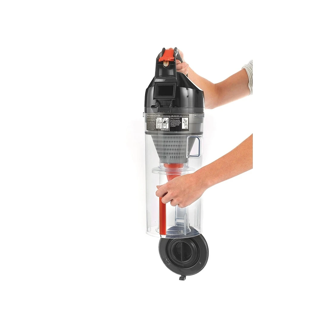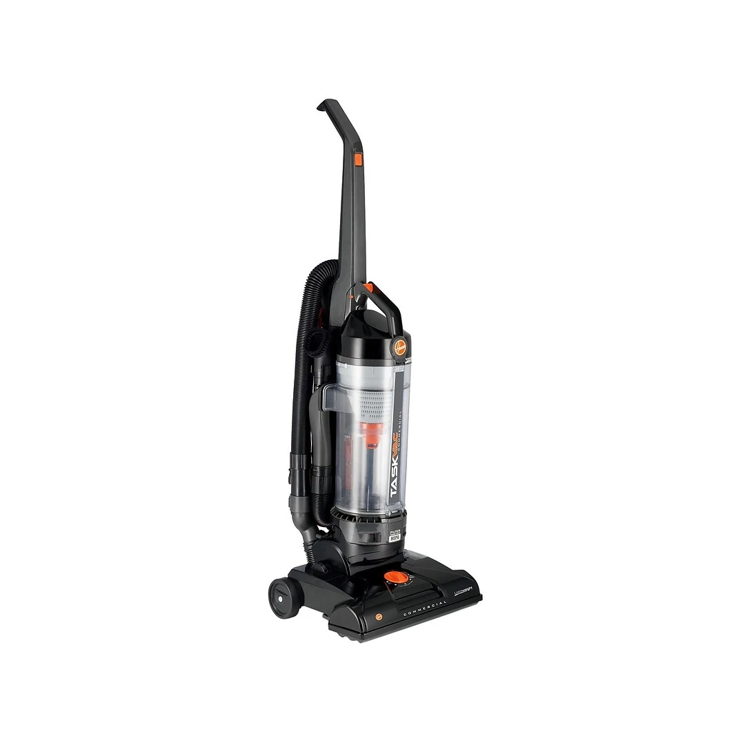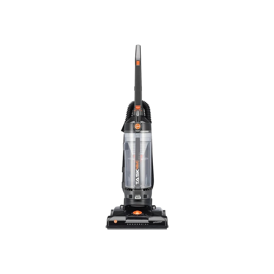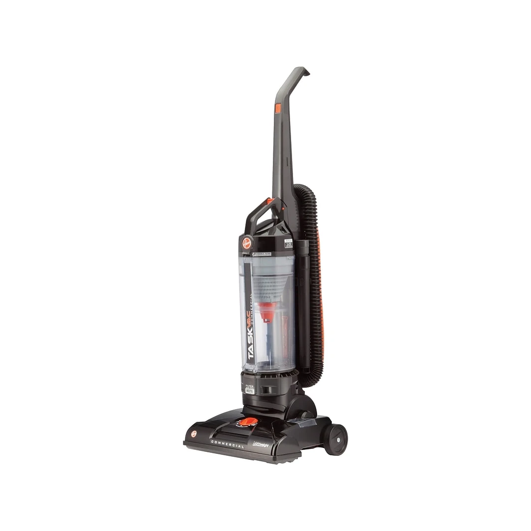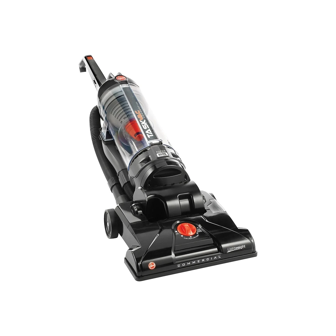 Bring deep cleaning action to your workspace with this upright vacuum. The HEPA filter works to remove dust and other small particles, while the removable dirt cup makes emptying a quick, easy task. This bagless vacuum features a simple brushroll and belt replacement system for convenient maintenance. A long 8-foot stretch hose and cleaning accessory pack help you reach the top of windows, around corners, and under furniture, providing versatile cleaning capabilities. Use the height adjustment dial to transition effortlessly from one flooring surface to another. A handy performance check indicator lets you know when this vacuum needs maintenance, and the 35-foot cord means fewer plug changes as you clean. With a lightweight design and uniquely shaped D handle, this Hoover TaskVac upright vacuum cleaner allows for more comfortable maneuvering.