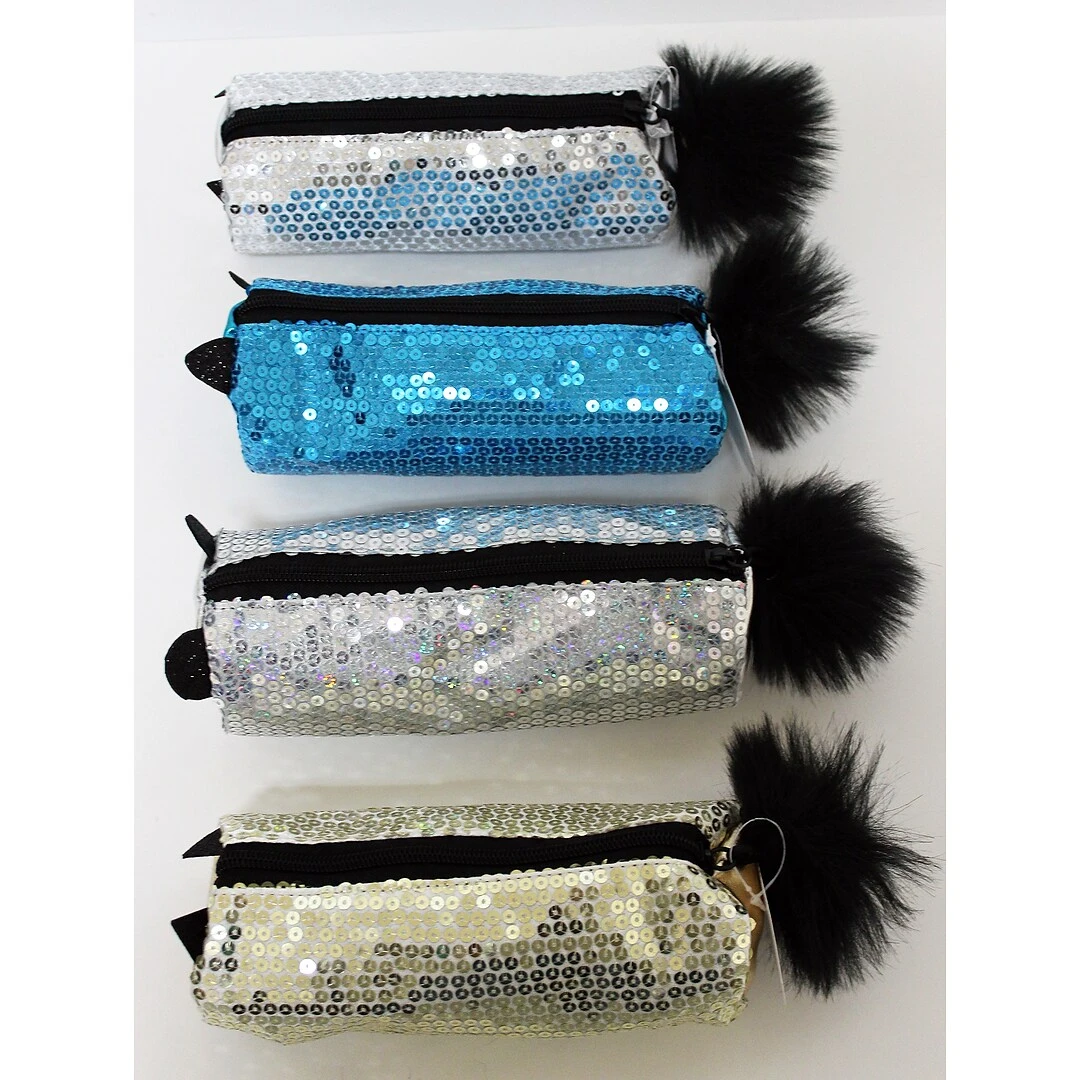 Metallic sequin barrel shaped case showing cute animal face on front and a pom pom zipper tail in back.