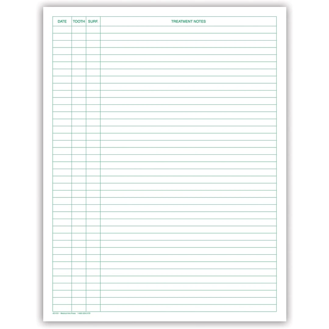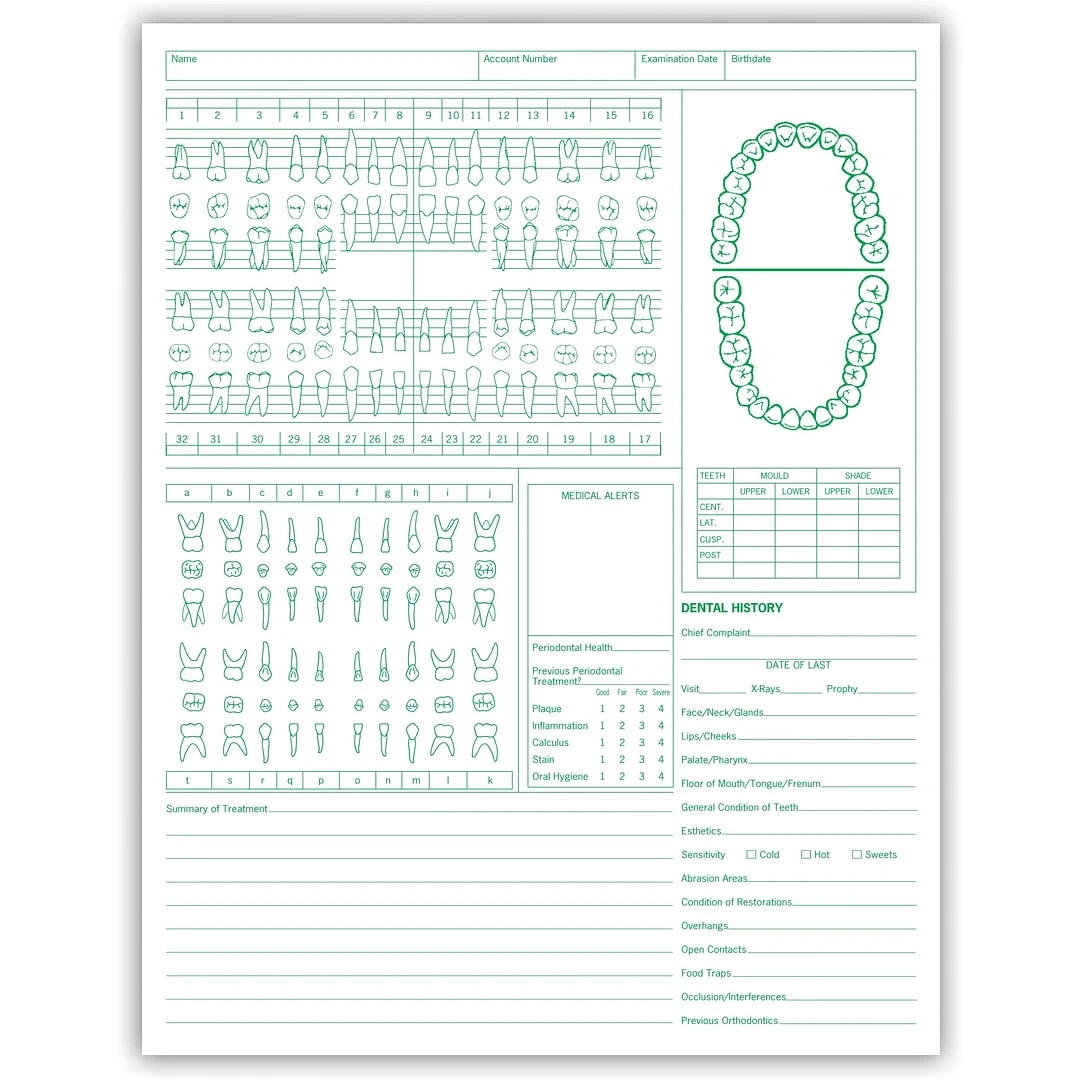Vertical format chart gives you plenty of space to record a thorough exam and dental history. Includes section on bridge work, and shade and mould information. Back side has treatment notes. Printed in green ink on 24-lb. ledger stock. 250 per package. Size: 8-1/2×11″.