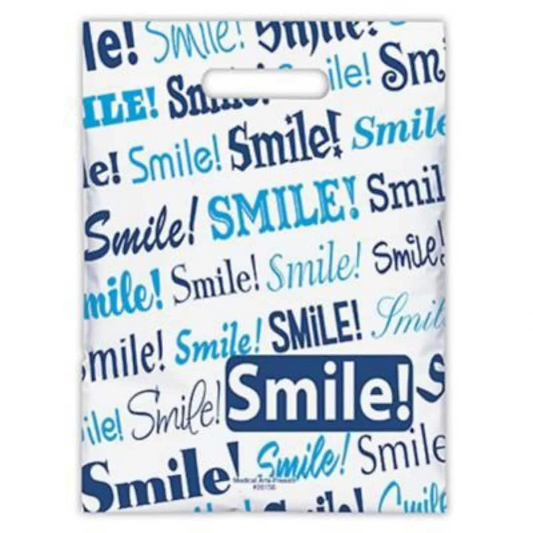 Small Scatter-Print Blue Smile Supply Bags allow patients to carry home supplies and giveaways. They feature an appealing dental-themed design with patterns on both sides and measures 7 x 10 inches in dimension.
