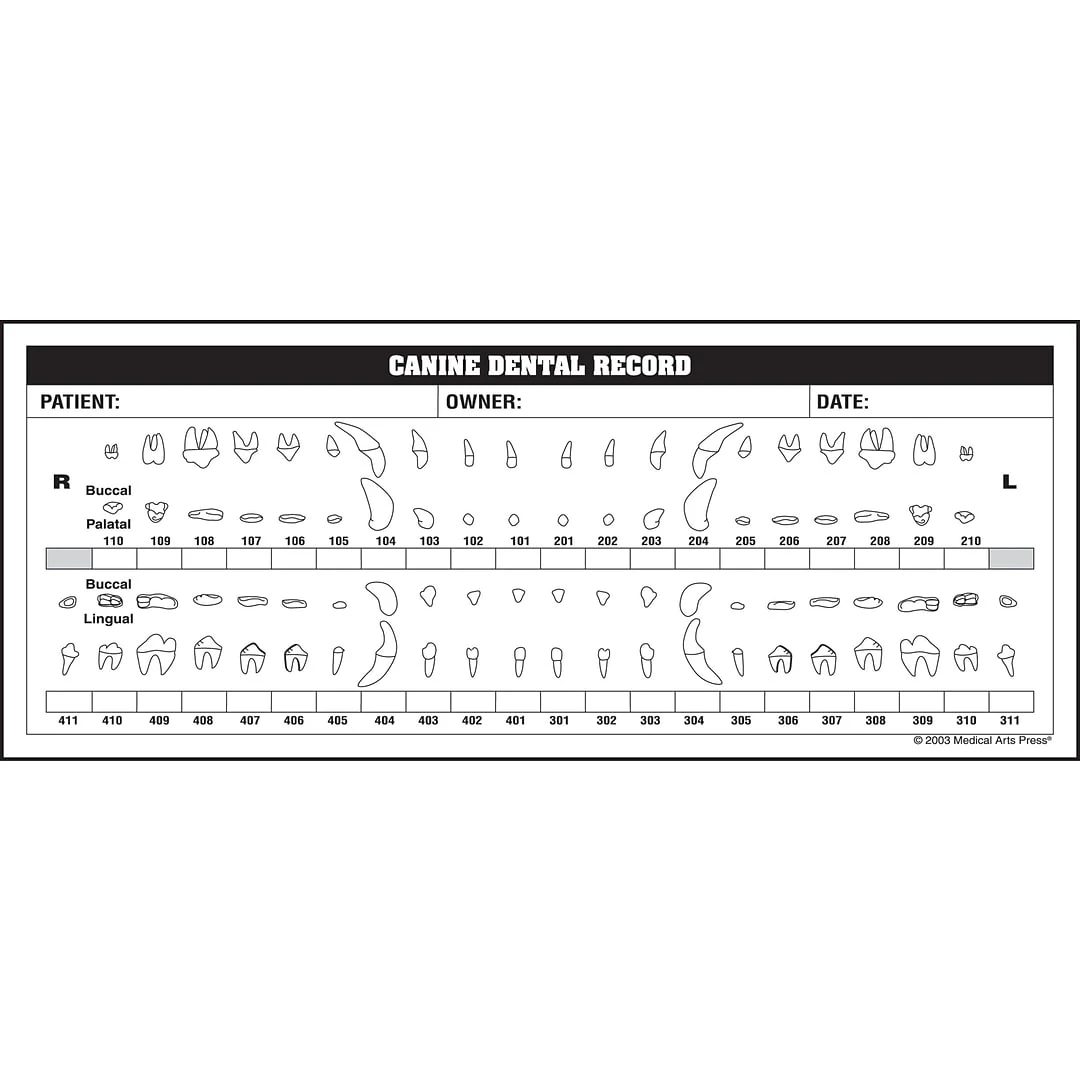 Quickly and easily record all relevant information from a complete oral exam on one compact form Labels use the Modified Triadan Veterinary Dental Number System for efficiency and to help streamline oral exam record keeping ove easily from backing for easy application to charts. Includes sections on top for recording Patient, Owner, and Date for accuracy and easy identification. Labels come 1 to a sheet, 250 labels per package. Printed in black ink. Label size: 8W x 3-1/4H.