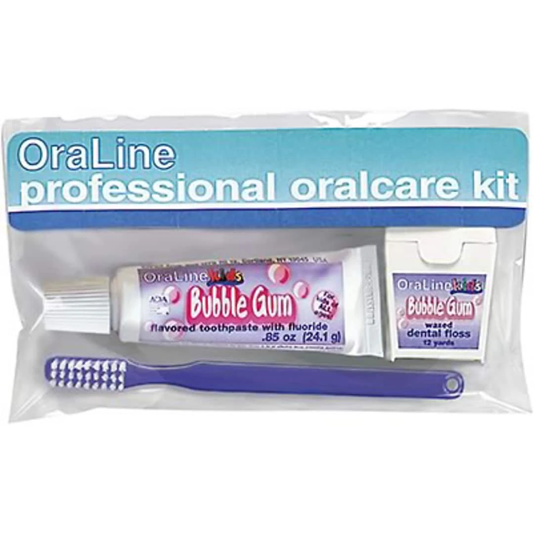 Includes 0.85oz. OraLine™ Kids’ Bubble Gum Toothpaste, Child’s Rainbow Toothbrush, and 12 yards of Bubble Gum Dental Floss