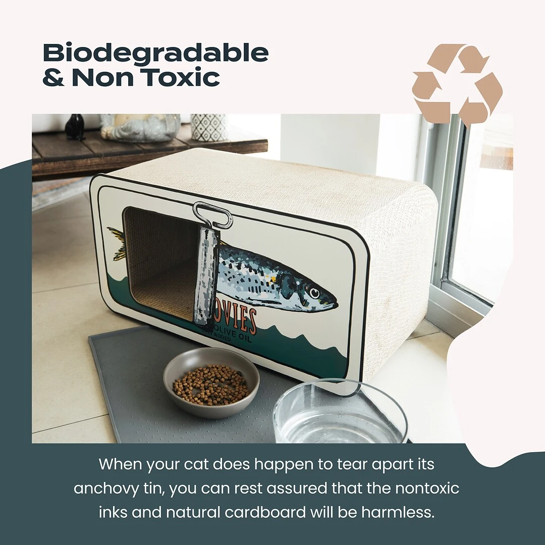 Biodegradable & Non Toxic – The scratcher is colored with nontoxic inks and natural cardboard. If (or when) your kitty goes in for the attack, he’ll be safe even with a mouthful of his anchovy tin.