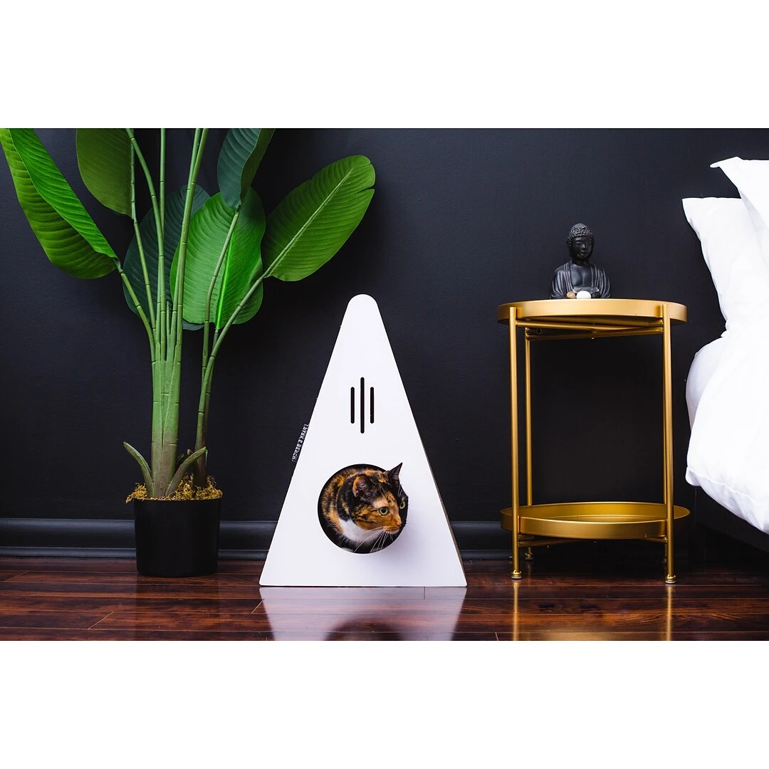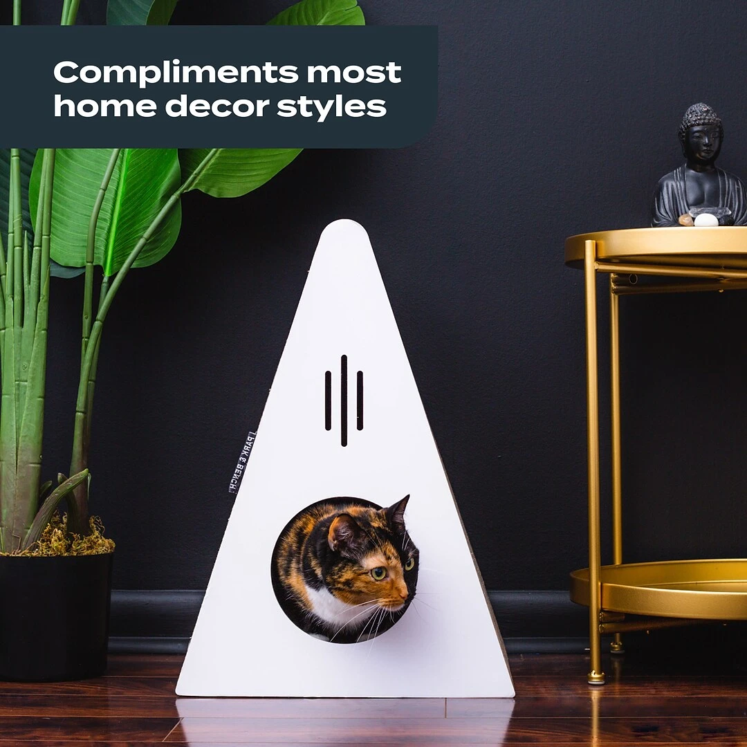 Park & Bench’s Key Largo Cat Hut provides your feline friend with a bright, white resort made to brighten up the room (and brighten up your cat’s day). Made from sturdy, sustainable corrugated cardboard and non-toxic inks.