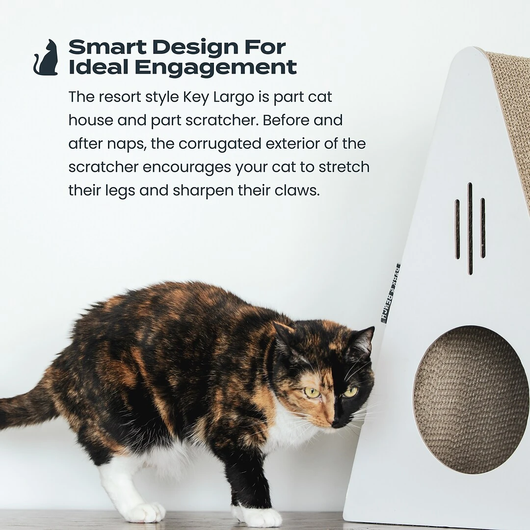 Smart Design For Ideal Engagement – The Key Largo Scratcher is part cat house and part scratcher. Before and after naps, the corrugated exterior of the scratcher encourages your cat to stretch their legs and sharpen their claws, as the texture is meant to mimic tree bark. Better the scratcher than your expensive couch!