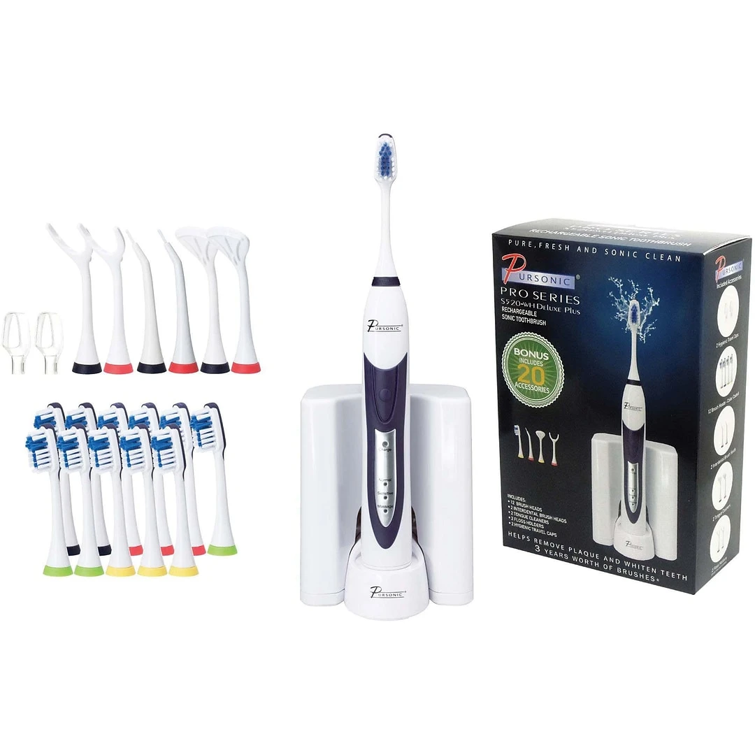 The Pursonic® S520BK white rechargeable sonic toothbrush with 12 brush heads, helps to whiten teeth, freshen breath and improves overall oral hygiene. This toothbrush provides 40000 ultra powerful per strokes minute to remove even the toughest stains without irritating your gums, using three different operating modes. It has a 2-min auto-timer with a 30 secs vibrate alert system in order to remind you to switch to a different quadrant of your mouth. The multiple-colored toothbrush heads makes identification easier for shared use. It comes with two tongue cleaners, two interdental brush heads and two floss holders.
