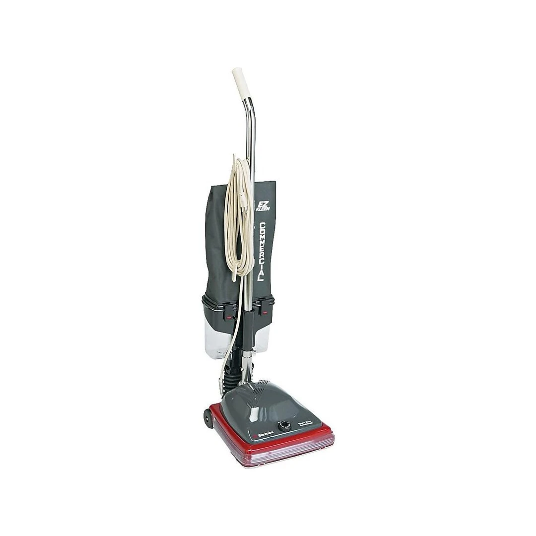 Clean floors in your office or commercial building with this upright vacuum. The 30-foot cord ensures freedom of movement, so you can vacuum larger areas without having to stop and reposition the plug. A handy dust cup means no bags to contend with, so you can empty out the contents quickly. The quick-release latch provides convenient access to the cup whenever it needs to be emptied. This vacuum weighs just 14 pounds, allowing for easy transport and a more comfortable user experience. Use the built-in wrap to keep the cord neatly tucked away between uses. With tool-free belt and brush replacement, this commercial vacuum offers fast, simple maintenance. The extended-life motor delivers long-lasting use, while the quiet operation is ideal for use even during business hours. With a gray and red color scheme, this Saintaire TRADITION vacuum brings a professional look to your workspace.